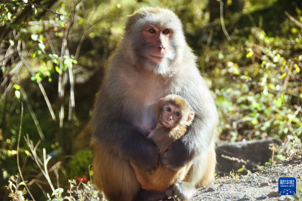 一只藏獼猴帶著幼猴在路邊張望(10月25日攝)。新華社記者 劉文博 攝