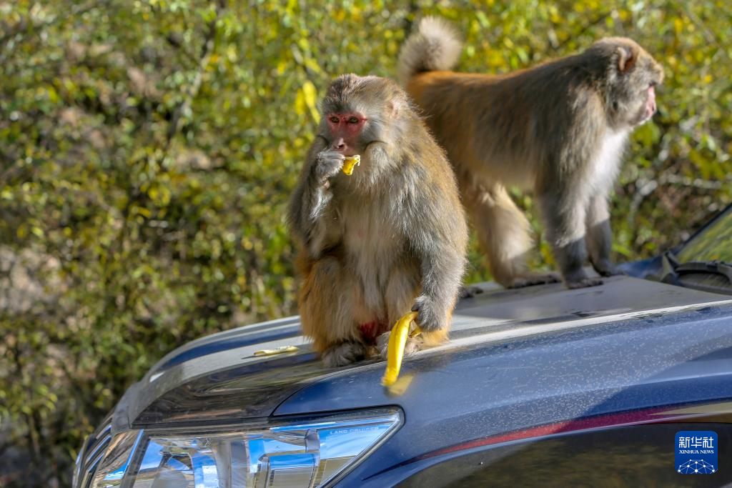 藏獼猴蹲在車頂上吃游客喂食的香蕉(10月25日攝)。新華社記者 邵澤東 攝 ??