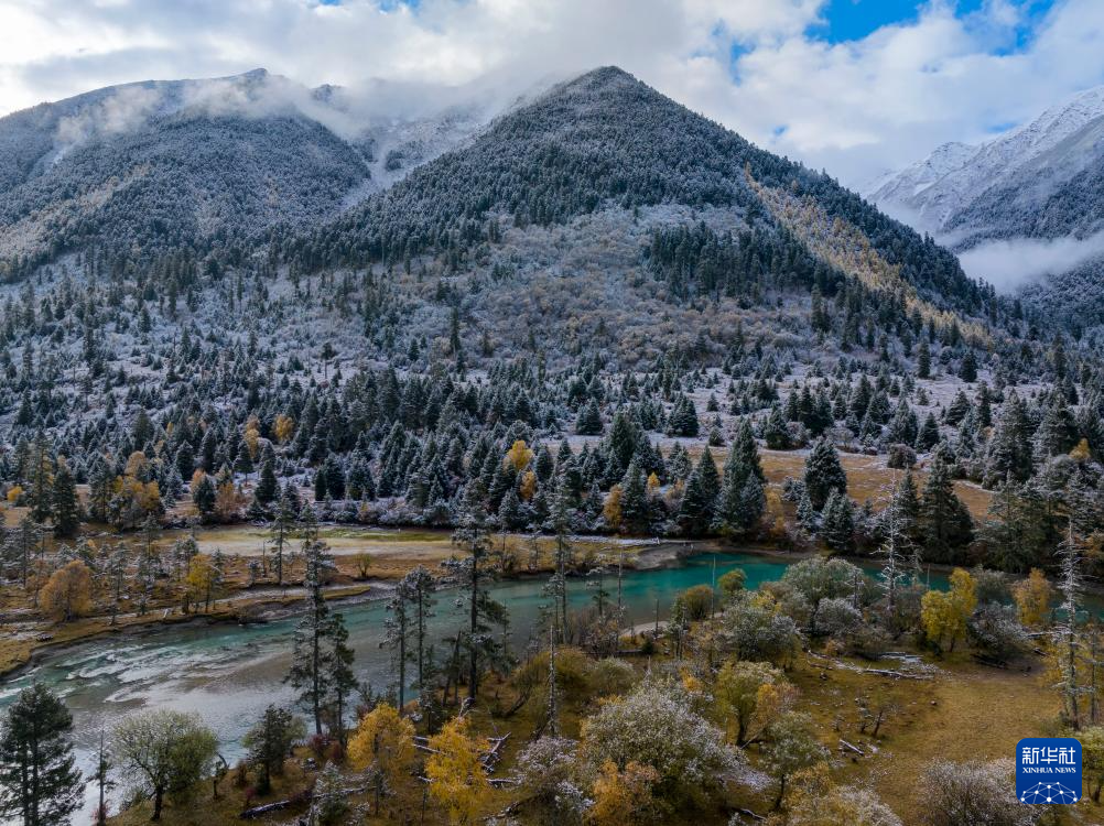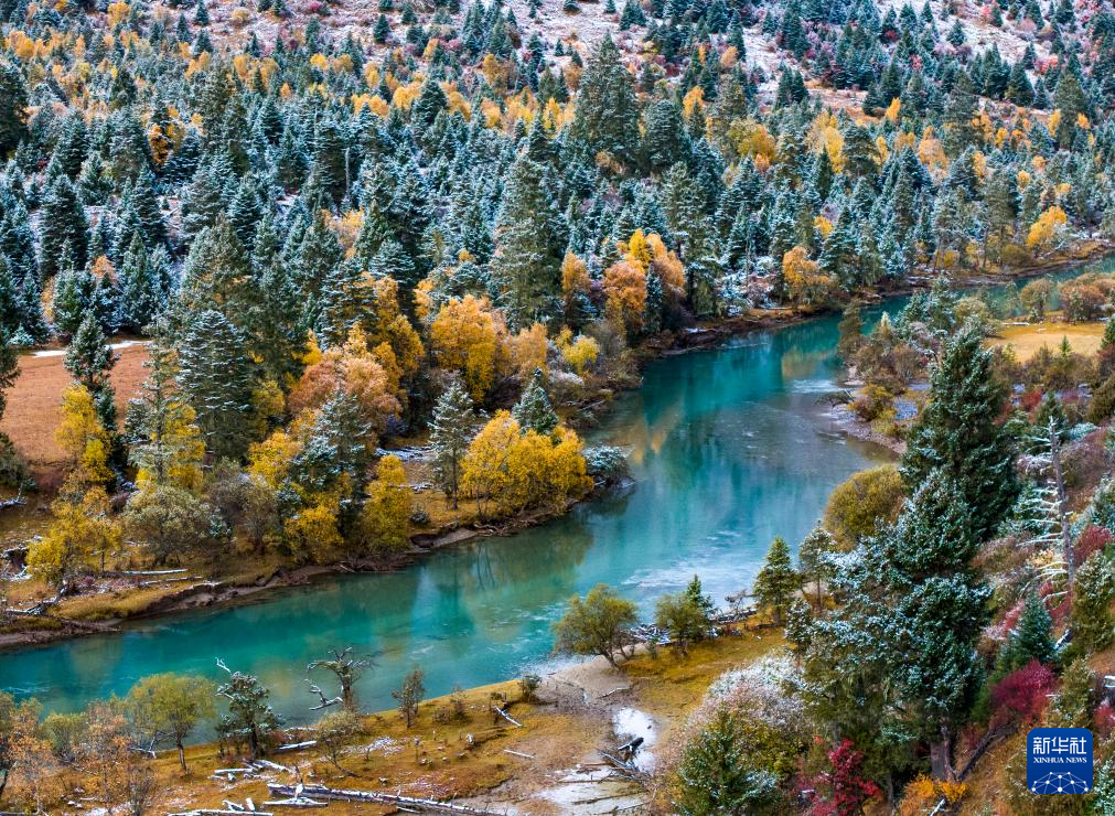 時(shí)值金秋,西藏林芝市秋色已濃,黃葉與初雪交織,流水并雪山輝映,景色如詩(shī)如畫。