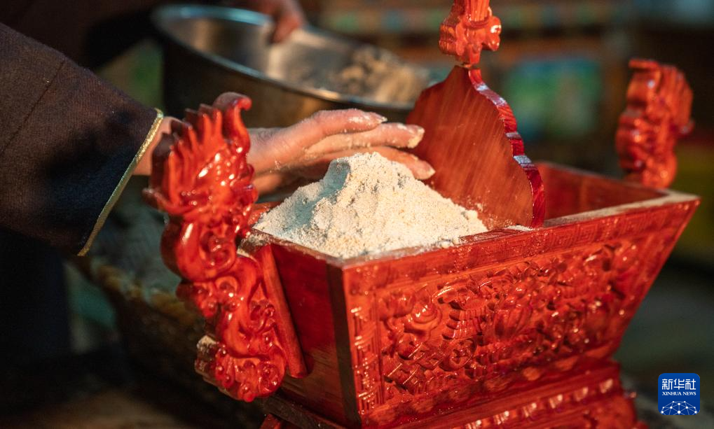 工布新年的年三十,次仁頓珠(左)和拉巴卓瑪在準備寓意五谷豐登的“切瑪”(11月13日攝)。新華社記者 姜帆 攝