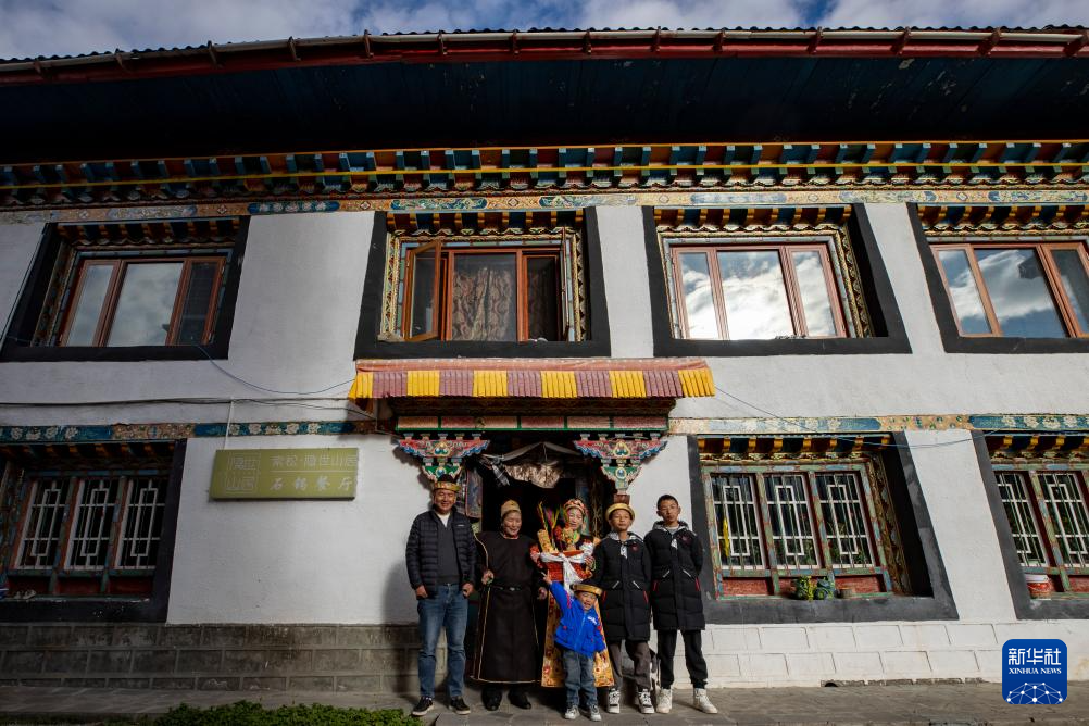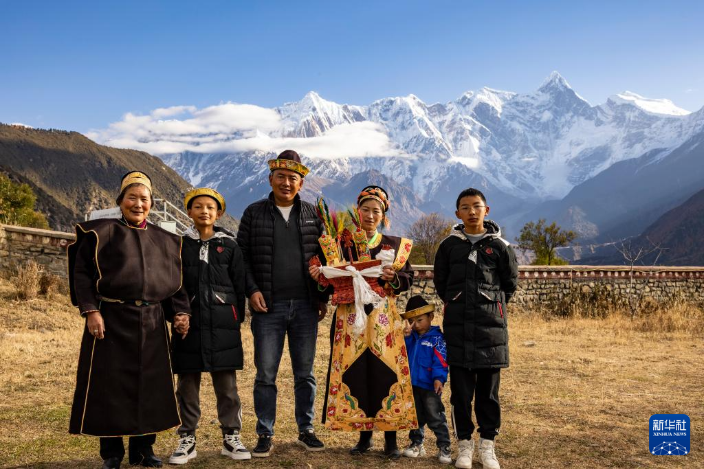 工布新年的大年初一,次仁頓珠(左一)和拉巴卓瑪(左三)一家在自家房前拍攝全家福(11月14日攝)。新華社記者 黃耀漫 攝