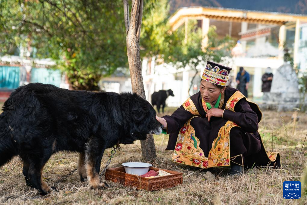 工布新年的大年初一,拉巴卓瑪按照習俗“請狗赴宴”,為家里的狗端來了新鮮牛肉、糌粑和牛奶(11月14日攝)。新華社記者 丁增尼達 攝