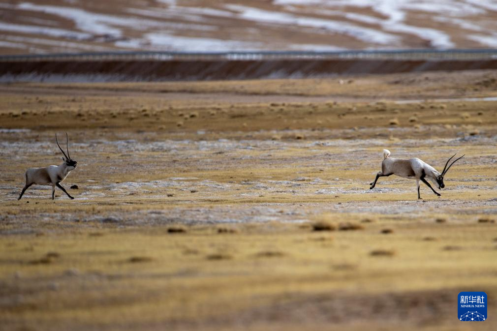 在羌塘國(guó)家級(jí)自然保護(hù)區(qū),一只雄性藏羚羊在奔向雌性(12月16日攝)。新華社記者 姜帆 攝
