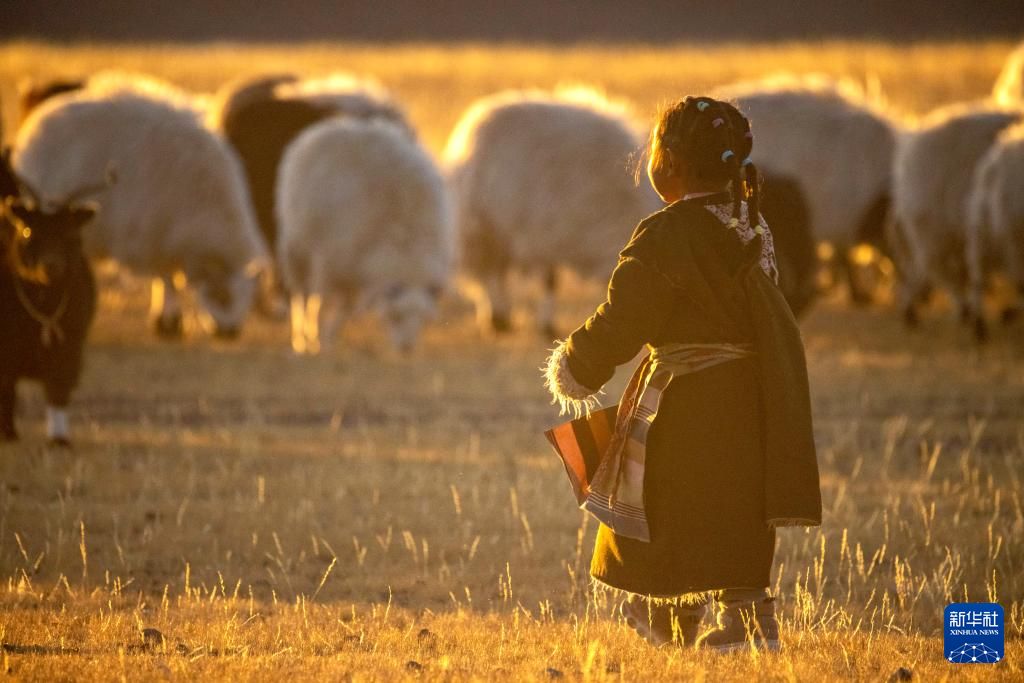 太陽(yáng)落山,丹增的妹妹、4歲的拉姆卓瑪奔向牧歸的羊群(12月18日攝)。新華社記者 姜帆 攝