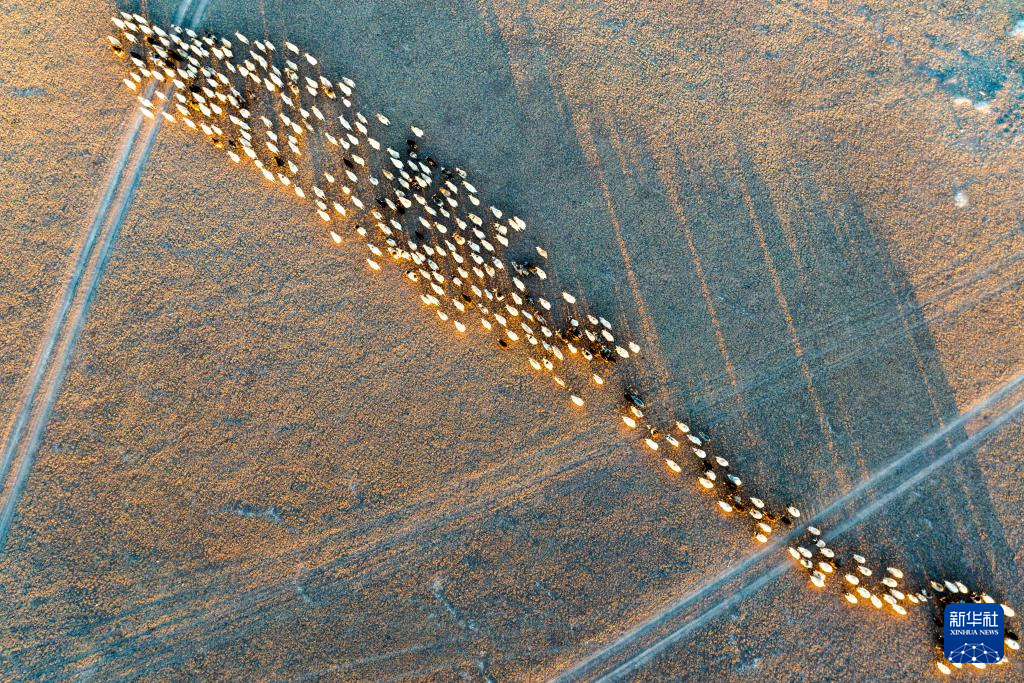 太陽(yáng)落山,丹增家的羊從草場(chǎng)趕回棚圈(無(wú)人機(jī)照片,12月18日攝)。新華社發(fā)(旦增努布攝)
