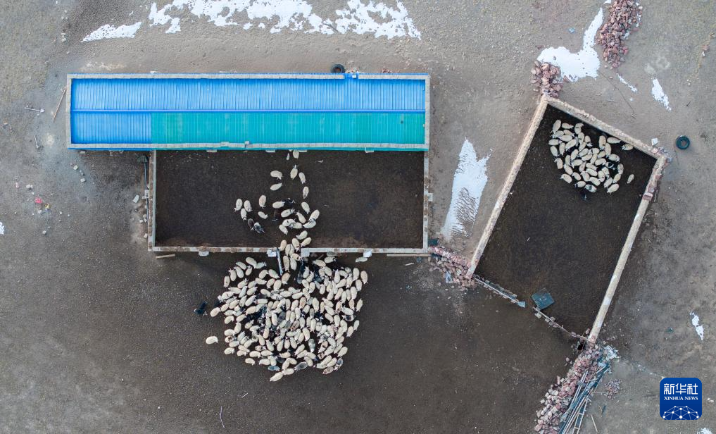 太陽(yáng)落山,丹增家的羊回到棚圈。其中左側(cè)藍(lán)頂?shù)氖侨ツ晷律w的封閉式棚圈,右側(cè)是傳統(tǒng)的敞開式羊圈(無(wú)人機(jī)照片,12月18日攝)。新華社記者 姜帆 攝