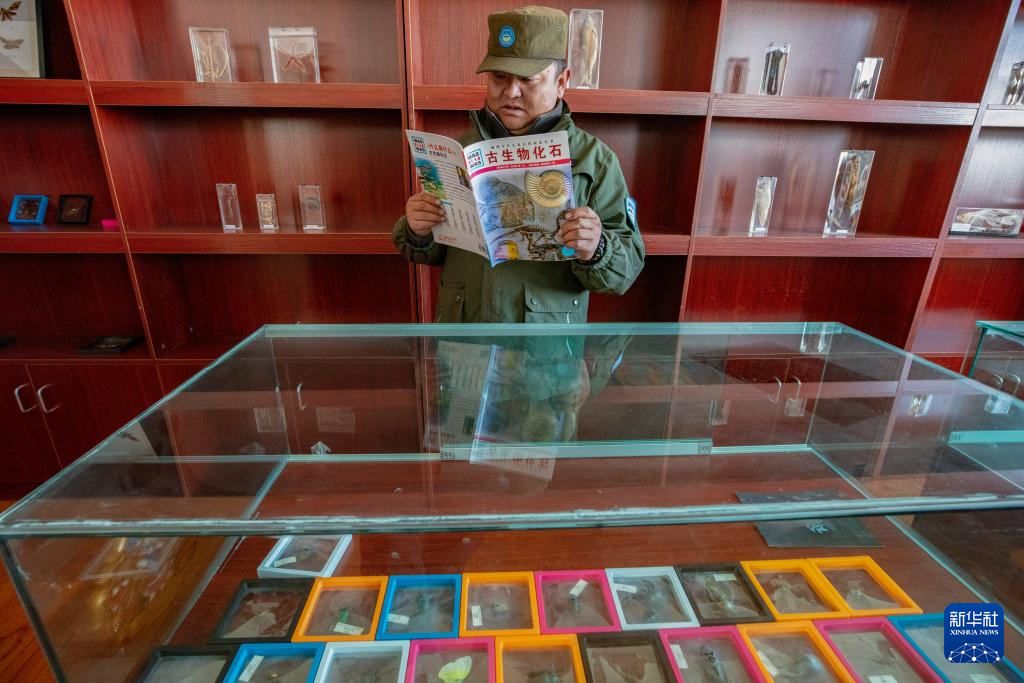 格桑倫珠在站里收集的化石標(biāo)本前看書(shū)(12月21日攝)。新華社記者 姜帆 攝