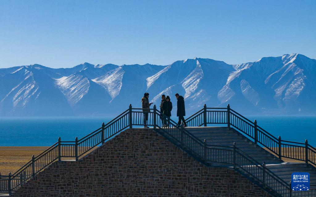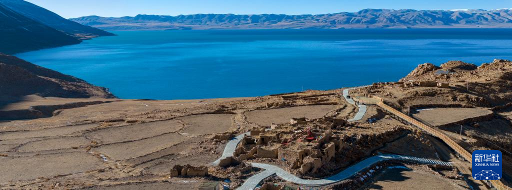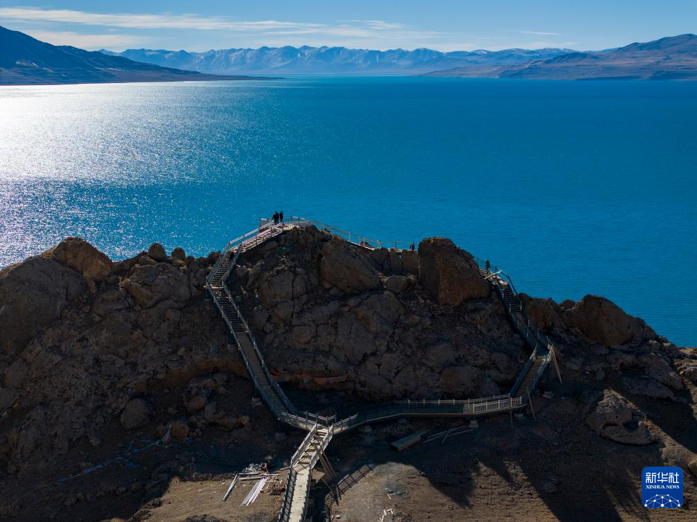這是當(dāng)惹雍錯旁剛剛竣工的棧道和觀景臺(無人機照片,12月20日攝)。新華社記者 格桑朗杰 攝