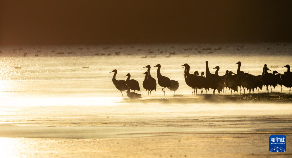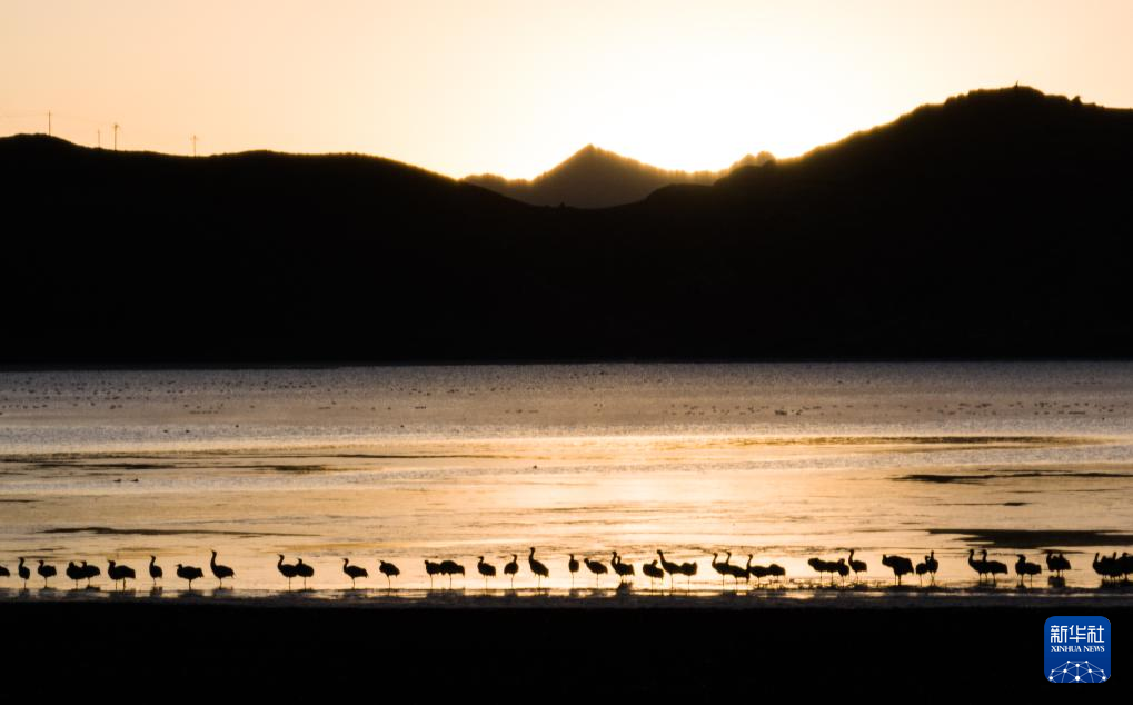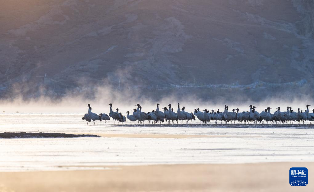 拉薩北部的林周縣平均海拔約4200米,是黑頸鶴的主要越冬地之一。清晨的陽光灑在林周縣虎頭山水庫,水面波光粼粼,鶴影婀娜多姿。