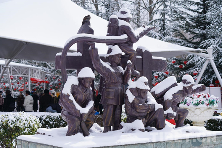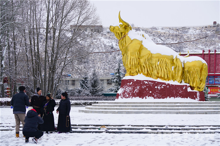 第二站,銅牛廣場(chǎng)。銅牛廣場(chǎng)位于布達(dá)拉宮西南方向約300米處,北京中路與林廓西路在此相交。這里是開放式的人行道,非常開闊,是通往布達(dá)拉宮廣場(chǎng)的必經(jīng)之路,很多人都在此合影留念。雪中的銅牛披上了白色的“外衣”,更加體現(xiàn)出“憨厚、忠誠、悲憫、堅(jiān)韌、勇悍、盡命”的牦牛精神。