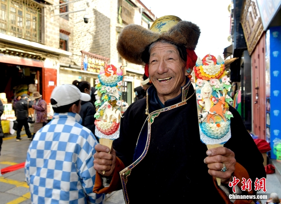 1月30日,手工藝人杰布展示制作完成的酥油花。[詳細] -