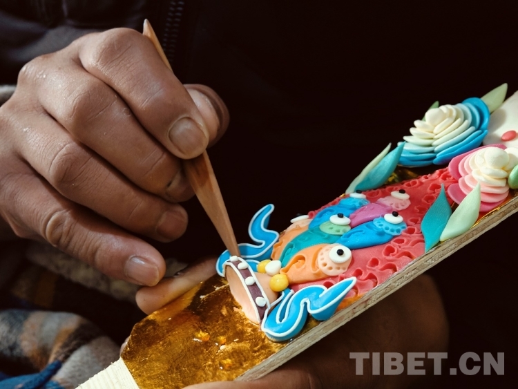 頓珠的二兒子丹增朗杰今年只有19歲,是一名高中生,但制作酥油花的手法已經(jīng)極為嫻熟。他盤腿而坐,面前擺放著調(diào)制好的各色酥油和一盆清水。只見他捏取一小塊酥油在冷水中浸泡一會(huì),然后熟練地用食指和拇指將酥油捏成不同形狀,粘貼于一塊盾形木板上,一對(duì)對(duì)色彩斑斕、寓意吉祥的酥油花作品便完成了。