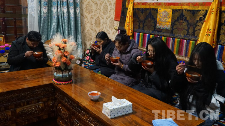 下午時分,“古突”夜的準備就開始了,先是將羊肉放入鍋中燉煮,再是將白蘿卜切片備好,隨后與奶奶、兩個女兒及丈夫,一家人圍坐在溫暖的廚房說說笑笑地捏“古突”里的面疙瘩,做面疙瘩時,要準備一些稍大的特殊面疙瘩,分別包進寫有石子、辣椒、羊毛、木炭等字樣的紙條,代表“心腸硬”“刀子嘴”“心腸軟”“黑心腸”等含義,待到吃“古突”環(huán)節(jié),來一場藏式風格的“開盲盒”,據說每個人吃到的字樣能在某種程度上代表新一年的運勢或性格。