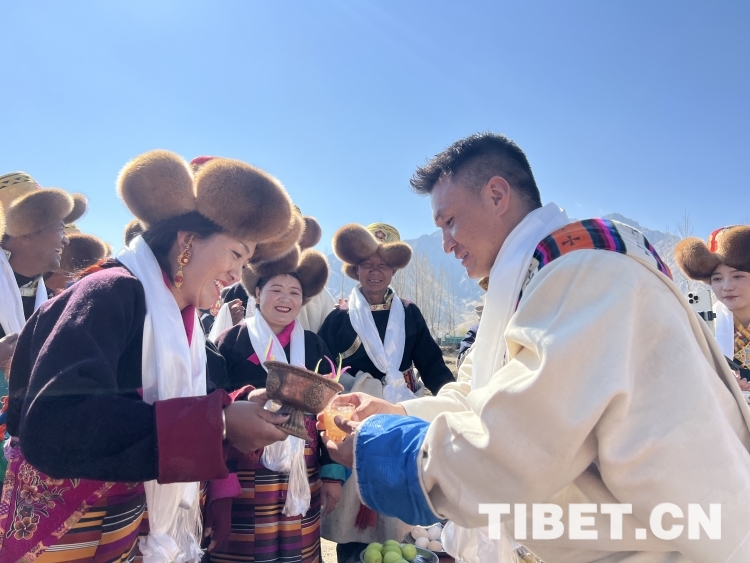 開耕儀式結(jié)束后,茶巴朗村藏戲隊成員們?yōu)樵缫褤Q好藏裝過來體驗西藏民俗文化的游客們獻(xiàn)哈達(dá)、敬青稞酒、唱敬酒歌,游客們現(xiàn)場學(xué)起“三口一杯”與當(dāng)?shù)厝斯捕冗@美好的一天。西藏卓美旅行社負(fù)責(zé)人孫赫男介紹說:“西藏除了山水美景之外,春耕儀式也是非常具有當(dāng)?shù)靥厣奈幕?,能給人留下深刻記憶。今天,我?guī)е鴣碜员鄙蠌V等全國各地的游客來這里體驗春耕儀式,讓大家看看西藏當(dāng)?shù)氐娜罕娛窃鯓娱_始春天的。游客們穿著藏裝,免費品嘗青稞酒、酥油茶、牛肉、藏雞蛋等各種農(nóng)產(chǎn)品,還和充滿熱情的當(dāng)?shù)卮迕駛兓樱麄兺娴梅浅i_心?!?