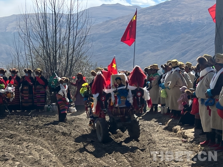 當(dāng)天,村里的男女老少穿上節(jié)日盛裝,手捧哈達(dá),高舉青稞美酒,從村子的各個(gè)角落來到村東頭一塊叫作“聶西滅”的肥沃土地上,男人們駕駛著用彩旗、花束妝點(diǎn)的拖拉機(jī),伴隨著一陣陣轟鳴聲,春耕儀式正式開始。新耕的第一犁,由一個(gè)屬相與今年屬相相符的婦女撒出吉祥、幸運(yùn)的種子,其余的拖拉機(jī)一對(duì)跟著一對(duì)地翻耕,每臺(tái)拖拉機(jī)后面都跟隨著一位盛裝的婦女,她們左手提一桶種子,右手有節(jié)奏地?fù)]擺,翻出沉寂一冬、透著泥土芬芳的肥沃土地,把種子撒入希望的田野。翻耕結(jié)束后,各家各戶把春耕歡慶時(shí)用的青稞酒、卡賽、切瑪?shù)葦[放在供桌上,孩子們?cè)谔镩g喧鬧戲耍,將村民們其樂融融、喜氣洋洋的美好生活景象體現(xiàn)的淋漓盡致。