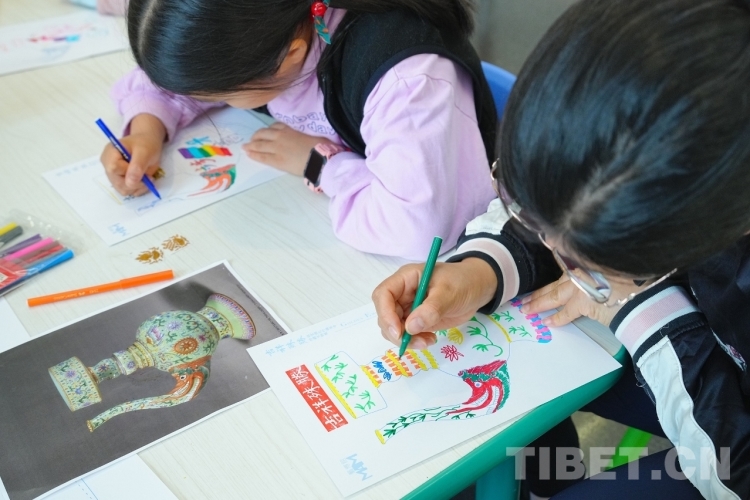 圖為參加“周日親子藝游”活動(dòng)的學(xué)生在畫(huà)具有藏族文化特色的奔巴壺(圖片由澳門(mén)藝術(shù)博物館提供)