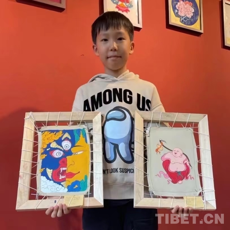 圖為體驗(yàn)郎卡杰唐卡繪制的小朋友及其作品