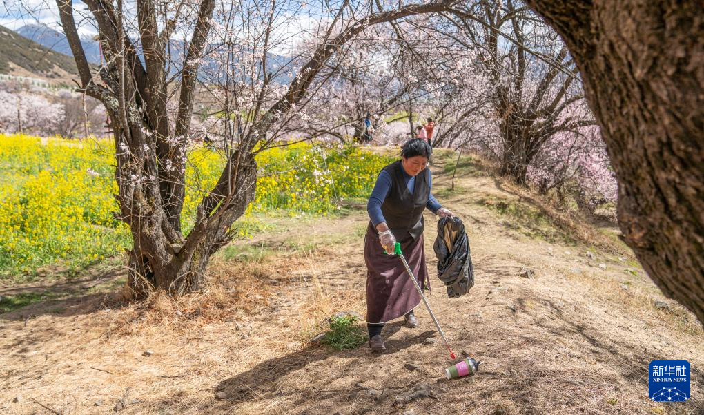 尼瑪曲吉在嘎拉村桃花園里撿拾垃圾(4月1日攝)。新華社記者 丁增尼達 攝