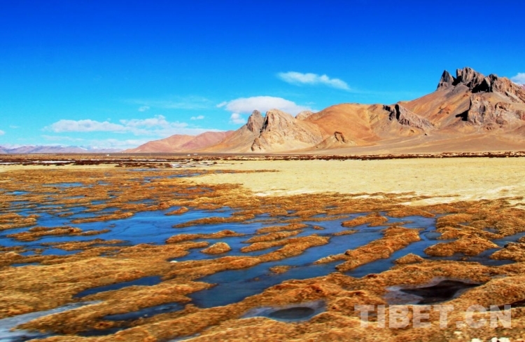 圖為晴朗的天氣里,西藏自治區(qū)阿里地區(qū)日土縣的一處濕地中倒映著蔚藍的天空 攝影:劉莉