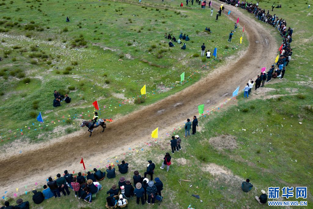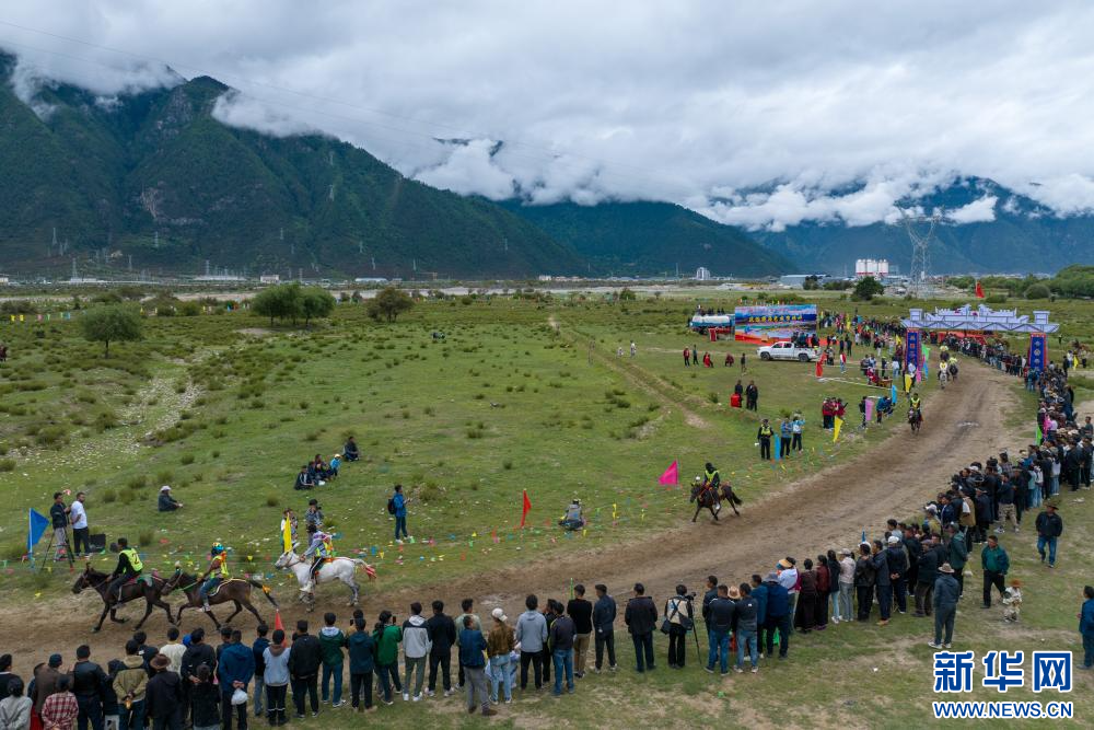 西藏林芝市林芝鎮(zhèn)第七屆尼洋旅游文化之民俗賽馬藝術節(jié)活動現場(7月22日攝,無人機照片)。新華網 旦增努布 攝