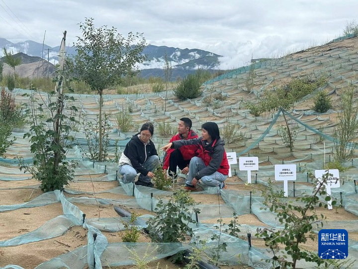 中國(guó)科學(xué)院成都山地災(zāi)害與環(huán)境研究所研究員周萍帶領(lǐng)研究生在西藏扎囊縣沙化土地生態(tài)治理綜合示范區(qū)開展沙地試驗(yàn)樣方植被生長(zhǎng)狀況監(jiān)測(cè)。新華社記者 顧天成 攝