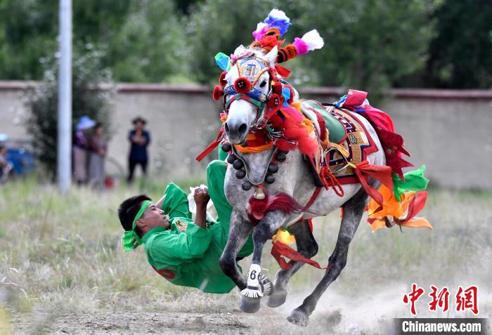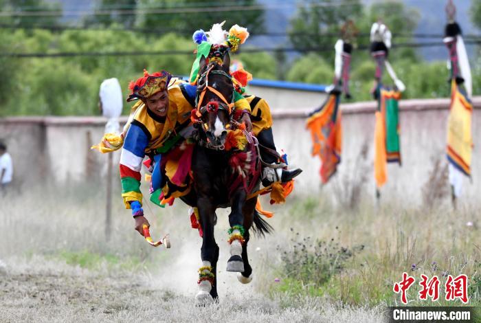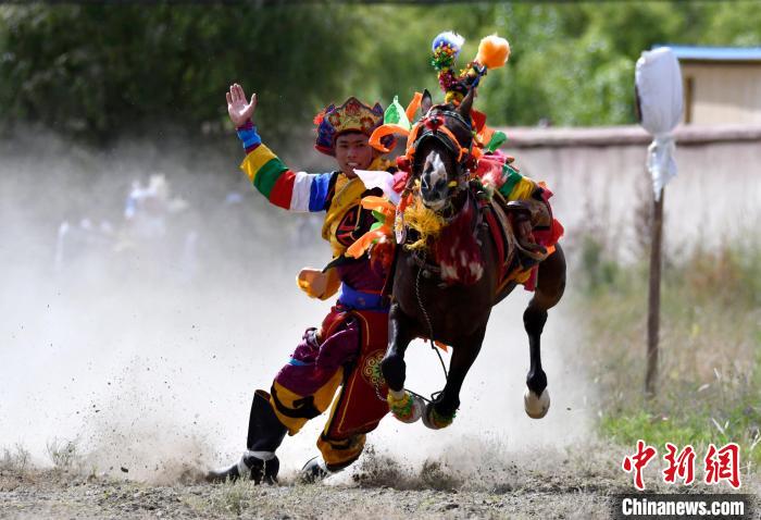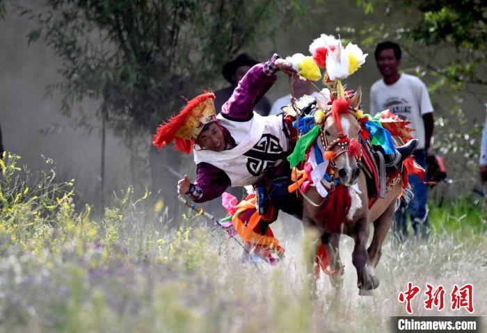 7月27日,西藏拉薩市桑達(dá)村迎來(lái)“望果節(jié)”,村民們舉行賽馬活動(dòng)慶祝。“望果節(jié)”是西藏傳統(tǒng)的豐收節(jié),具體日期隨各地莊稼成熟的時(shí)間而變化?!巴?jié)”期間,按照習(xí)俗,各地都會(huì)舉辦賽馬比賽。圖為騎手進(jìn)行馬術(shù)表演。中新社記者 李林 攝