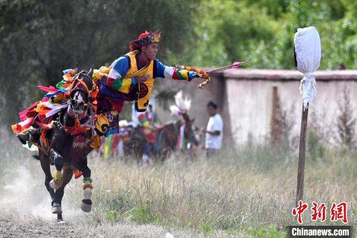7月27日,西藏拉薩市桑達(dá)村迎來(lái)“望果節(jié)”,村民們舉行賽馬活動(dòng)慶祝?!巴?jié)”是西藏傳統(tǒng)的豐收節(jié),具體日期隨各地莊稼成熟的時(shí)間而變化。“望果節(jié)”期間,按照習(xí)俗,各地都會(huì)舉辦賽馬比賽。圖為騎手進(jìn)行馬上射箭表演。中新社記者 李林 攝