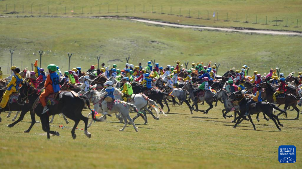 12日,10公里傳統(tǒng)大跑項(xiàng)目開賽,上百匹駿馬在草原上揚(yáng)蹄疾奔,騎手多是十來歲的少年。15歲的普扎巴從6歲開始做騎手,曾騎著當(dāng)?shù)卦S多名馬到各地參加比賽,拿過多次冠軍?!拔蚁嘈胚@次也能拿第一名。”10日,他在馬背上對(duì)記者說。