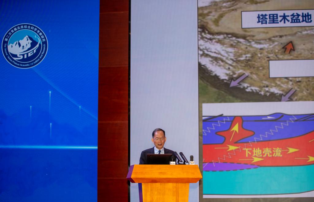 8月18日,第二次青藏科考隊(duì)隊(duì)長姚檀棟院士在拉薩對(duì)本次科考十大任務(wù)的重要成果進(jìn)行集中發(fā)布。新華社記者 姜帆 攝