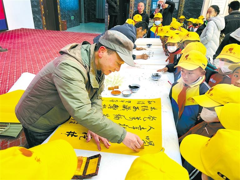 周明暉正在為學(xué)生示范書法創(chuàng)作。