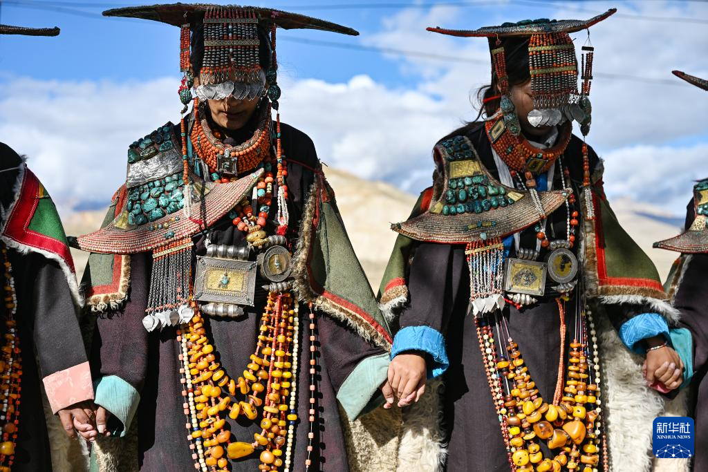 9月9日,在西藏阿里地區(qū)普蘭縣科迦村,村民展示普蘭服飾。新華社記者 孫瑞博 攝