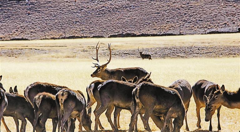 圖為成群的西藏馬鹿在悠閑地吃草。記者 白瑪澤旺 攝