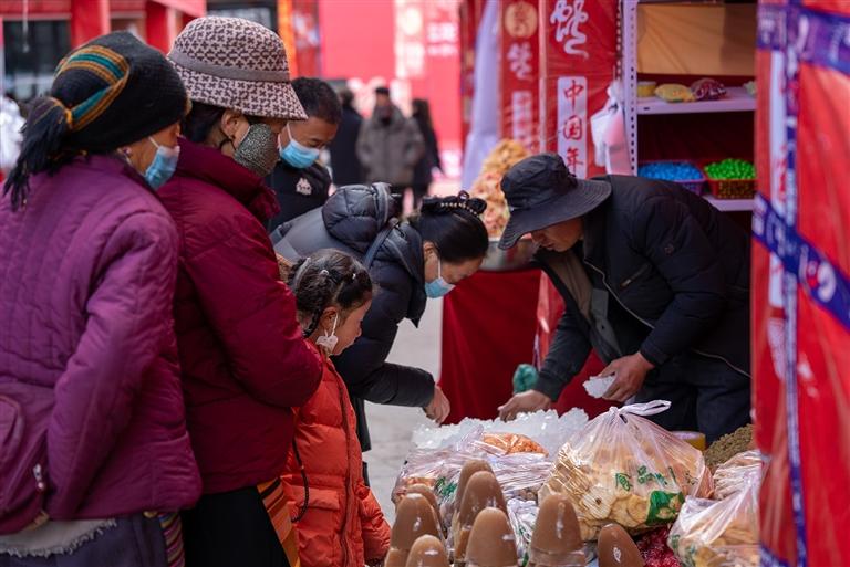 活動(dòng)當(dāng)天,記者來(lái)到位于拉薩市城關(guān)區(qū)蔡公堂街道恩惠苑社區(qū)翰林苑小區(qū)附近的年貨市場(chǎng),只見現(xiàn)場(chǎng)人聲鼎沸。150個(gè)攤位整齊排列,各類年貨商品琳瑯滿目,讓人目不暇接。這里有糖果、堅(jiān)果、酥油、卡塞等傳統(tǒng)食品,有豬肉、牛肉干、羊肉等肉類制品,還有臘味熟食、奶渣餅等特色小吃,以及藏文對(duì)聯(lián)、喜慶裝飾、廚具餐具等日用百貨,完全能滿足居民群眾一站式的年貨購(gòu)物需求。