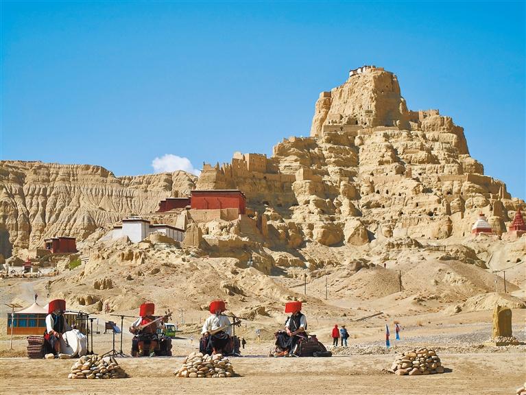 圖為5月19日,朵熱樂隊在札達縣古格王國遺址前彈奏民俗樂曲。記者 洛桑旦增 攝