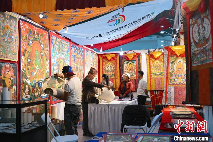 圖為拉薩進(jìn)口商品展覽會(huì)現(xiàn)場(chǎng),顧客在選購唐卡。中新社記者 貢嘎來松 攝