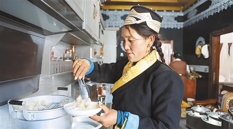 圖為朗縣拉丁雪村村民堅(jiān)阿措姆在嶄新的廚房里忙著盛裝熱氣騰騰的牛肉包子。 記者 謝筱純 攝