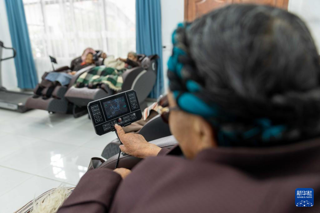 7月17日,老人們在三有村幸福驛站日間照料室的按摩椅上享受按摩。新華社記者 旦增尼瑪曲珠 攝 ??