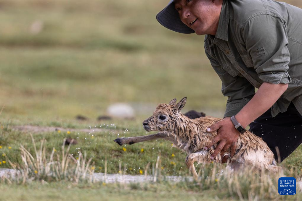 管護(hù)隊員次旺在救助一只被激流沖走的藏羚羊幼崽(7月14日攝)。新華社記者 姜帆 攝 ??