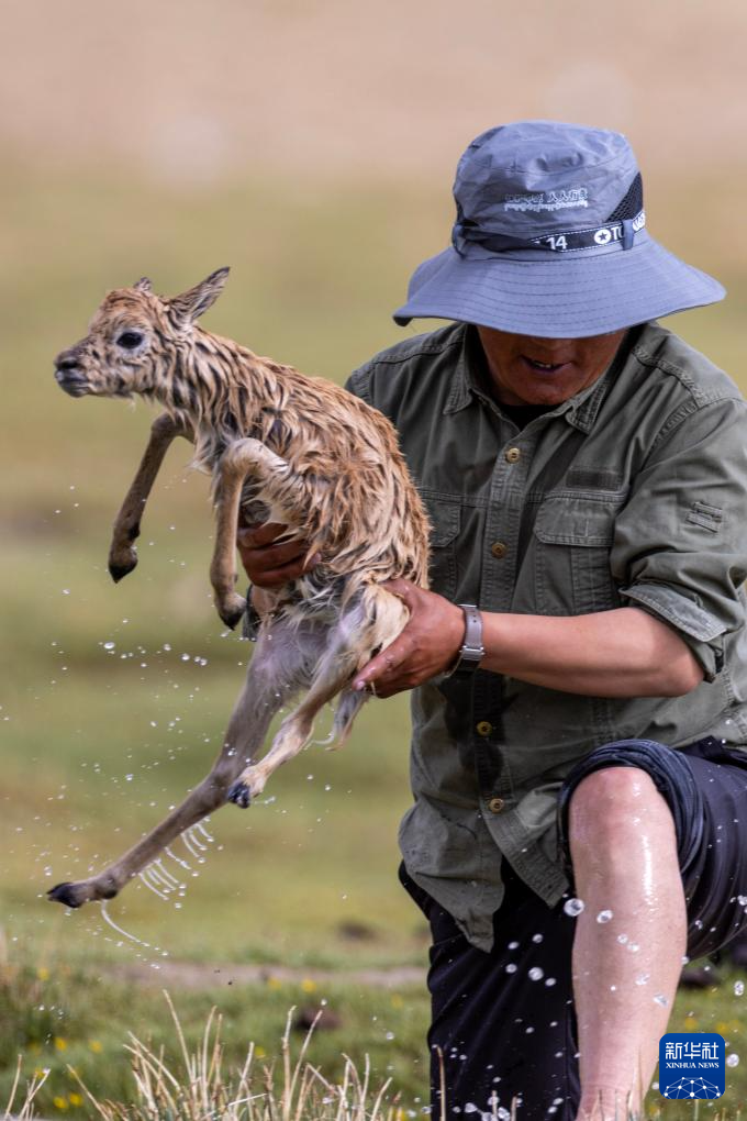 管護(hù)隊員次旺在救助一只被激流沖走的藏羚羊幼崽(7月14日攝)。新華社記者 姜帆 攝?
