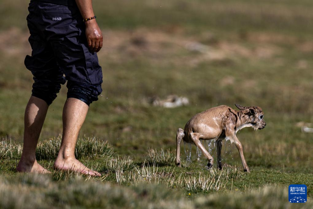 一只被激流沖走的藏羚羊幼崽被管護(hù)隊員救上岸(7月14日攝)。新華社記者 姜帆 攝??