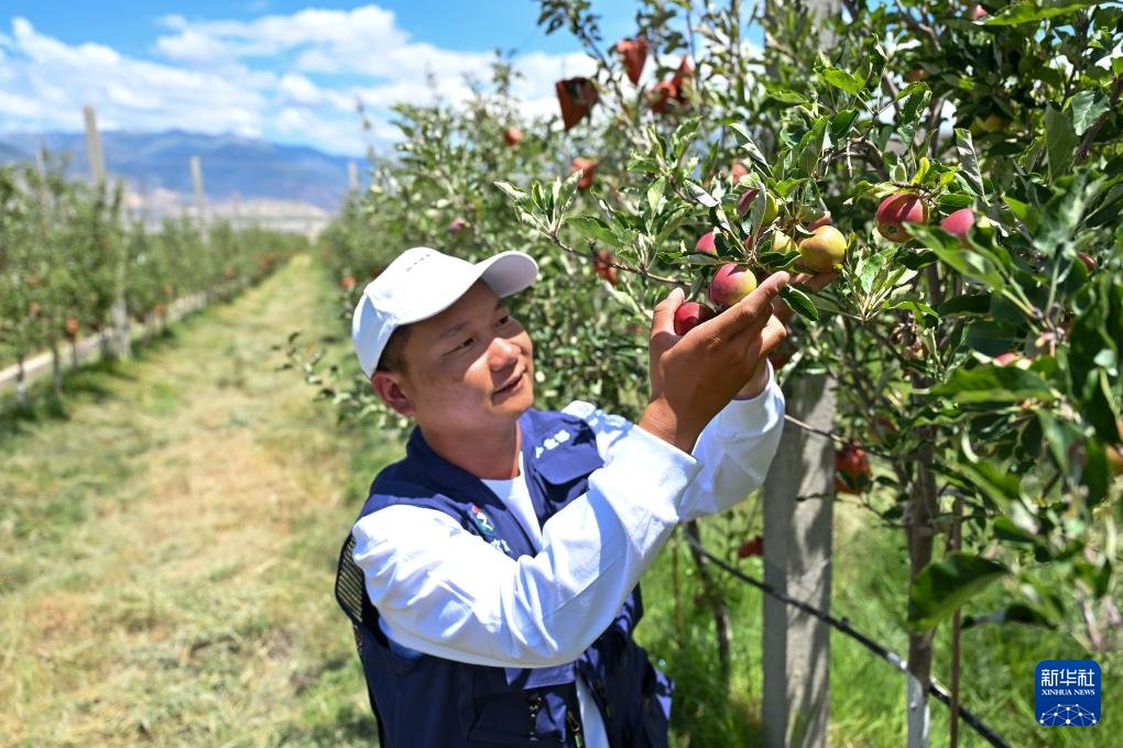 7月19日,西藏扎囊縣的矮化蘋果種植園區(qū)的工作人員查看蘋果長勢(shì)。新華社記者 李鑫 攝 ??