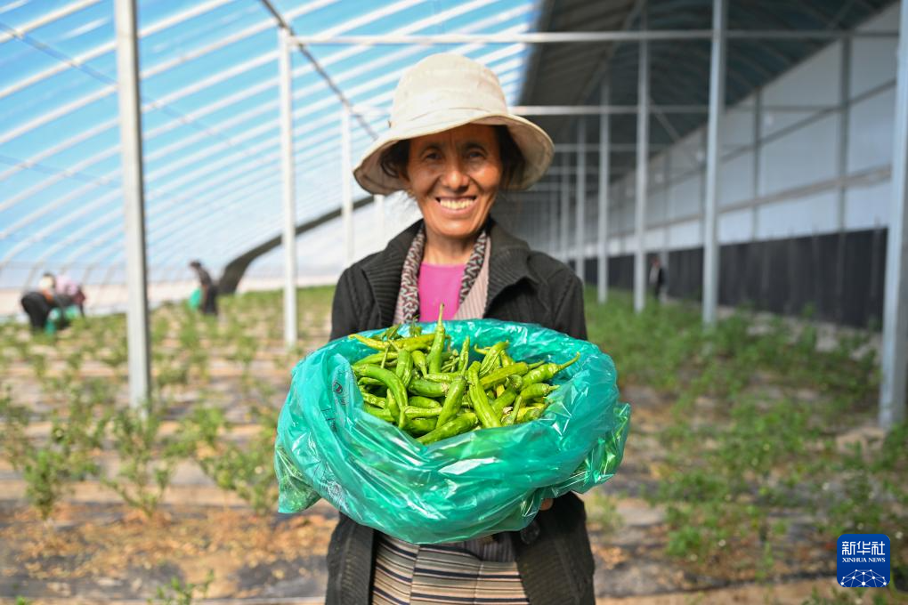 7月19日,西藏扎囊縣綠之源現(xiàn)代農(nóng)業(yè)科技股份有限公司的員工次旺拉吉展示剛采摘下來的有機(jī)辣椒。新華社記者 李鑫 攝 ??