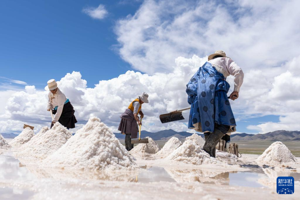 7月20日,革吉縣牧民在采鹽。新華社記者 旦增尼瑪曲珠 攝