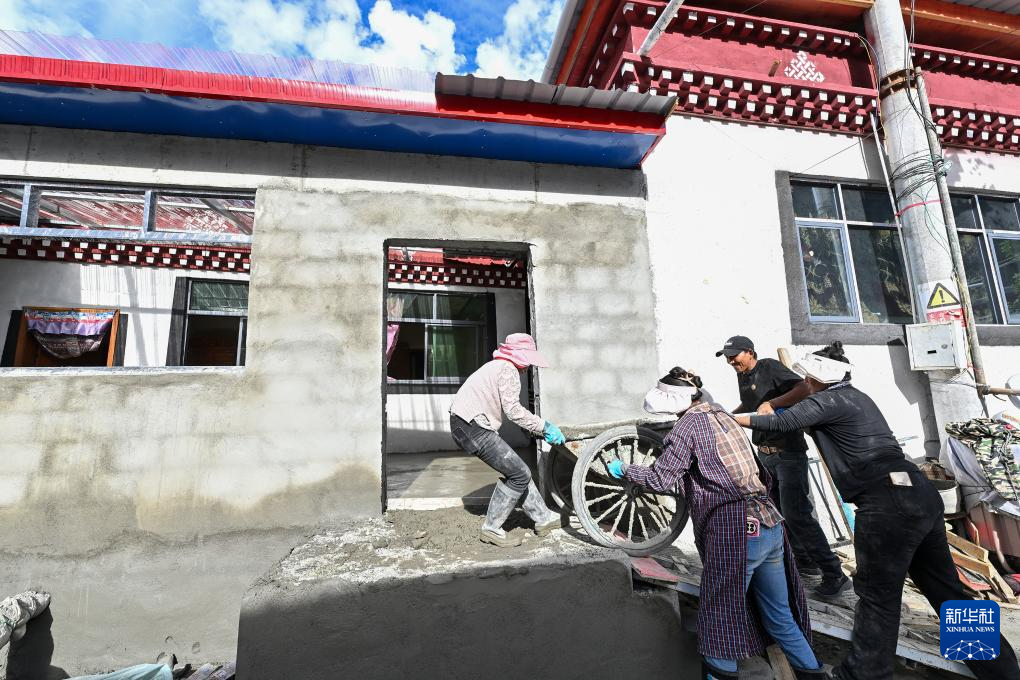 7月21日,51歲的拉丁雪村村民次旺羅布(右二)在村民的幫助下運(yùn)輸建筑材料,改造提升自己的房屋。新華社記者 李鑫 攝 ??