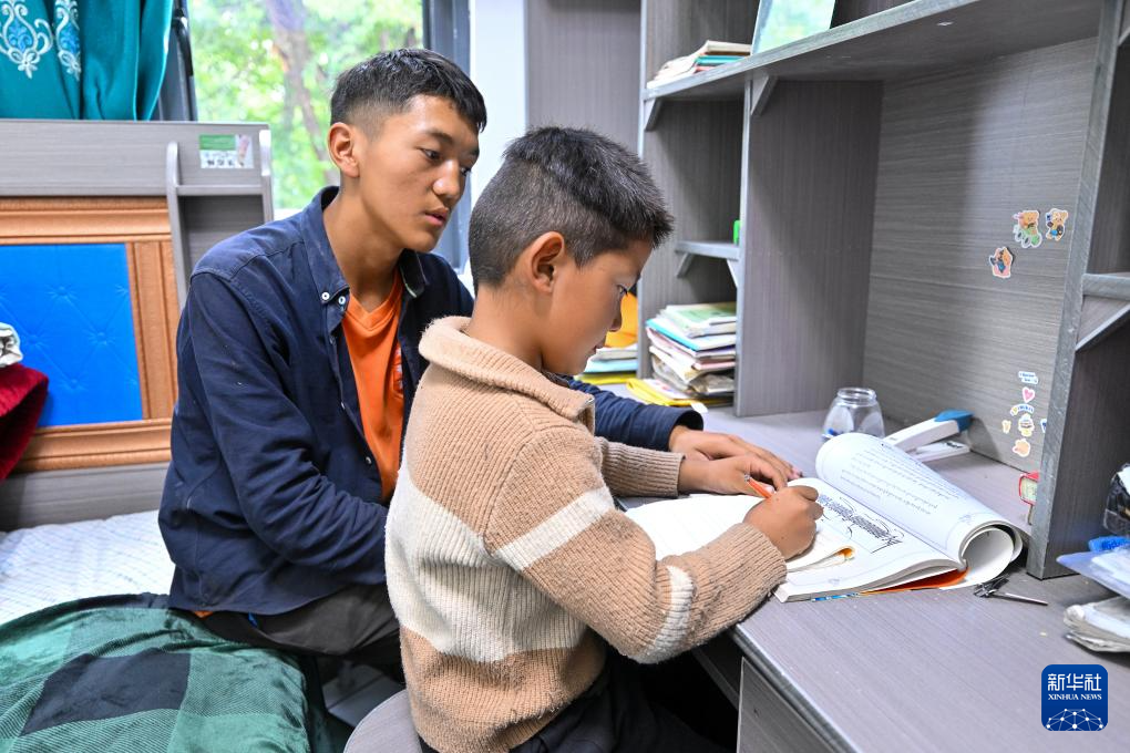 7月21日,17歲的米瑪次仁(左)在新房臥室內(nèi)輔導(dǎo)7歲的弟弟堅(jiān)阿達(dá)瓦寫作業(yè)。新華社記者 李鑫 攝 ??