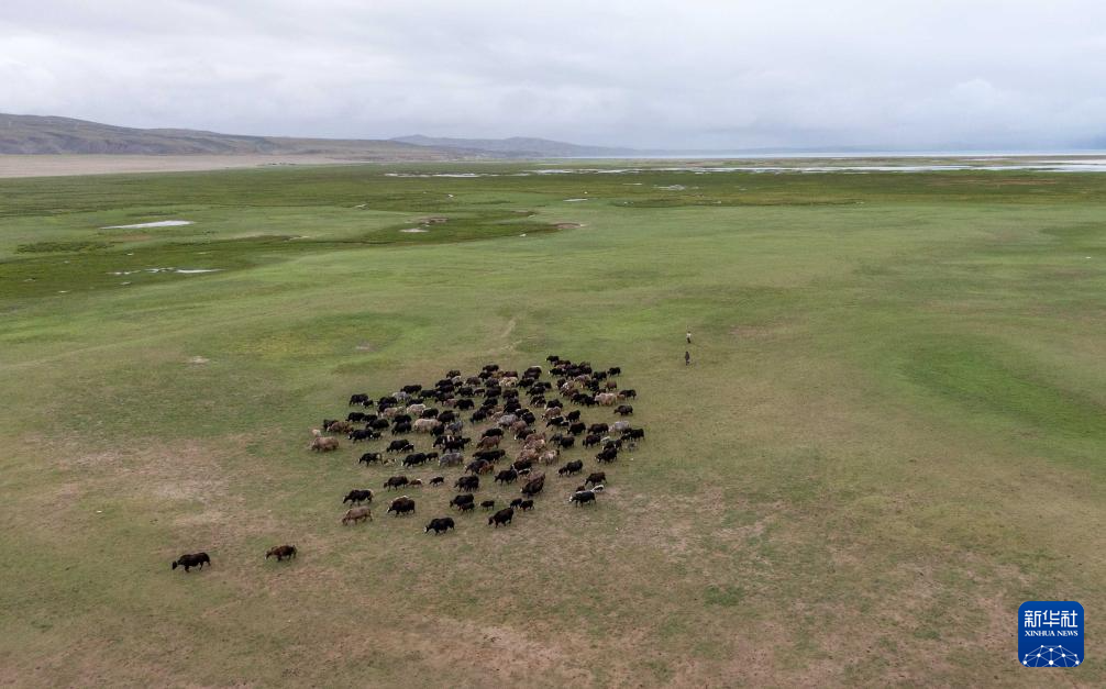 7月22日拍攝的瑪旁雍錯(cuò)濕地上的牦牛。新華社記者 旦增尼瑪曲珠 攝