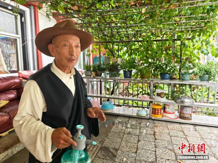7月22日,羅布在家中前院介紹自己嫁接的葡萄。中新社記者 程小路 攝