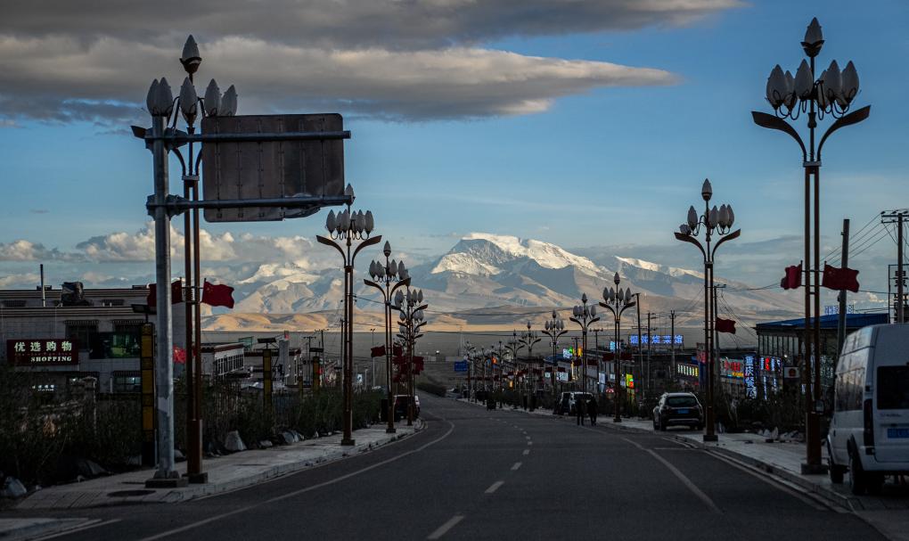 塔爾欽小鎮(zhèn)中心街道南望,可見(jiàn)終年積雪的納木那尼峰。新華社記者 丁增尼達(dá) 攝
