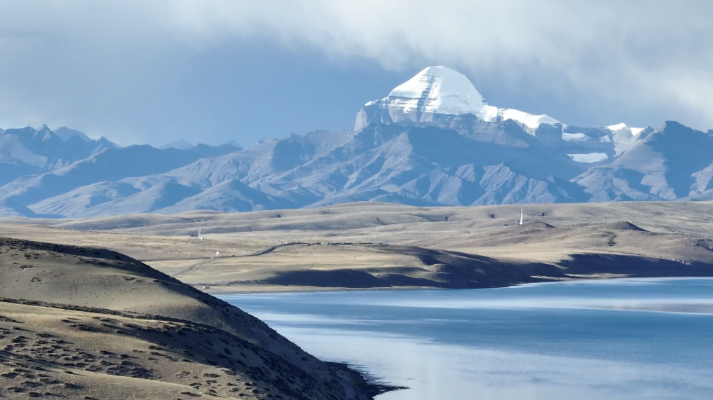 瑪旁雍錯(cuò)湖畔遠(yuǎn)眺,岡仁波齊靜立天際。新華社記者 黃智琪 攝
