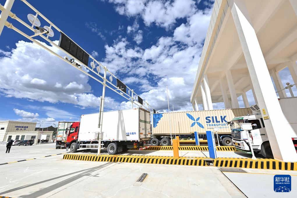 7月16日,貨車通過(guò)日喀則國(guó)際陸地港出口貨物查驗(yàn)場(chǎng)卡口。新華社記者 李鑫 攝
